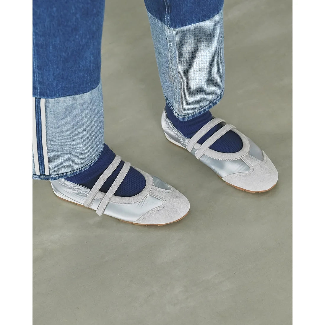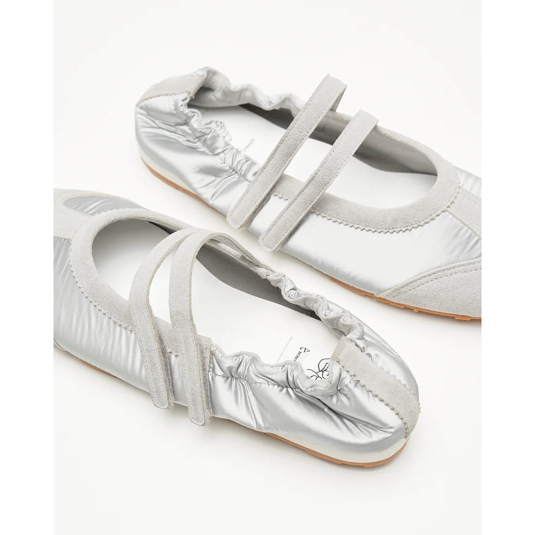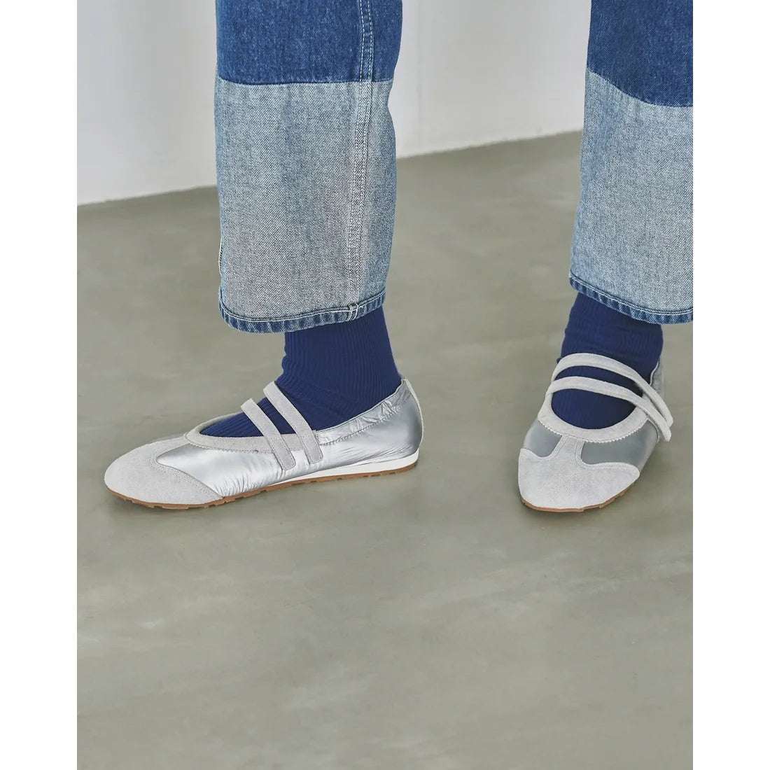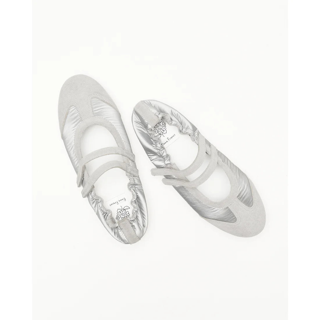 【新品】日本製Emma Francis 彈性褶邊瑪麗珍芭蕾舞鞋(銀色天鵝絨皮革)(09k-NY 162)