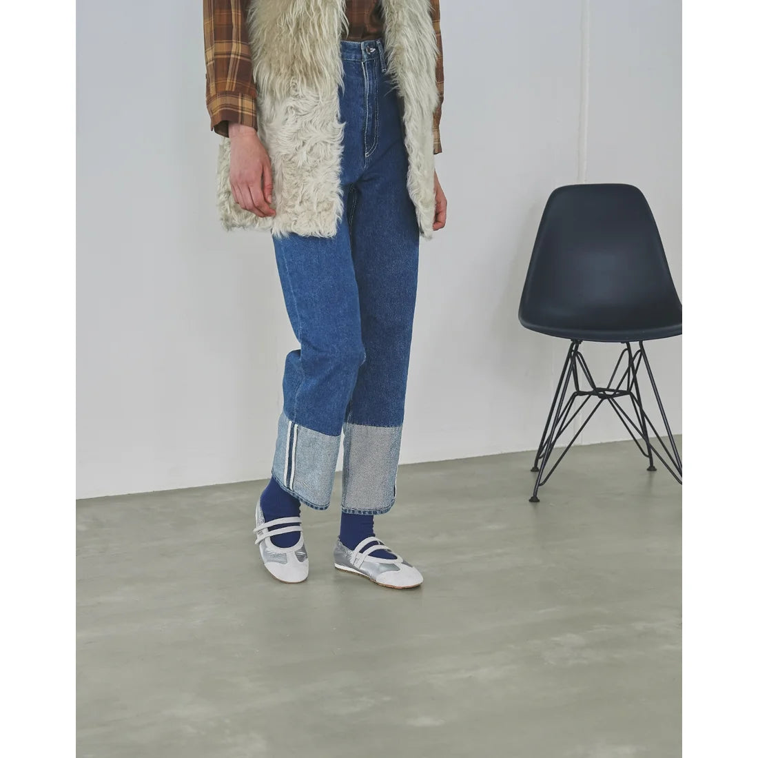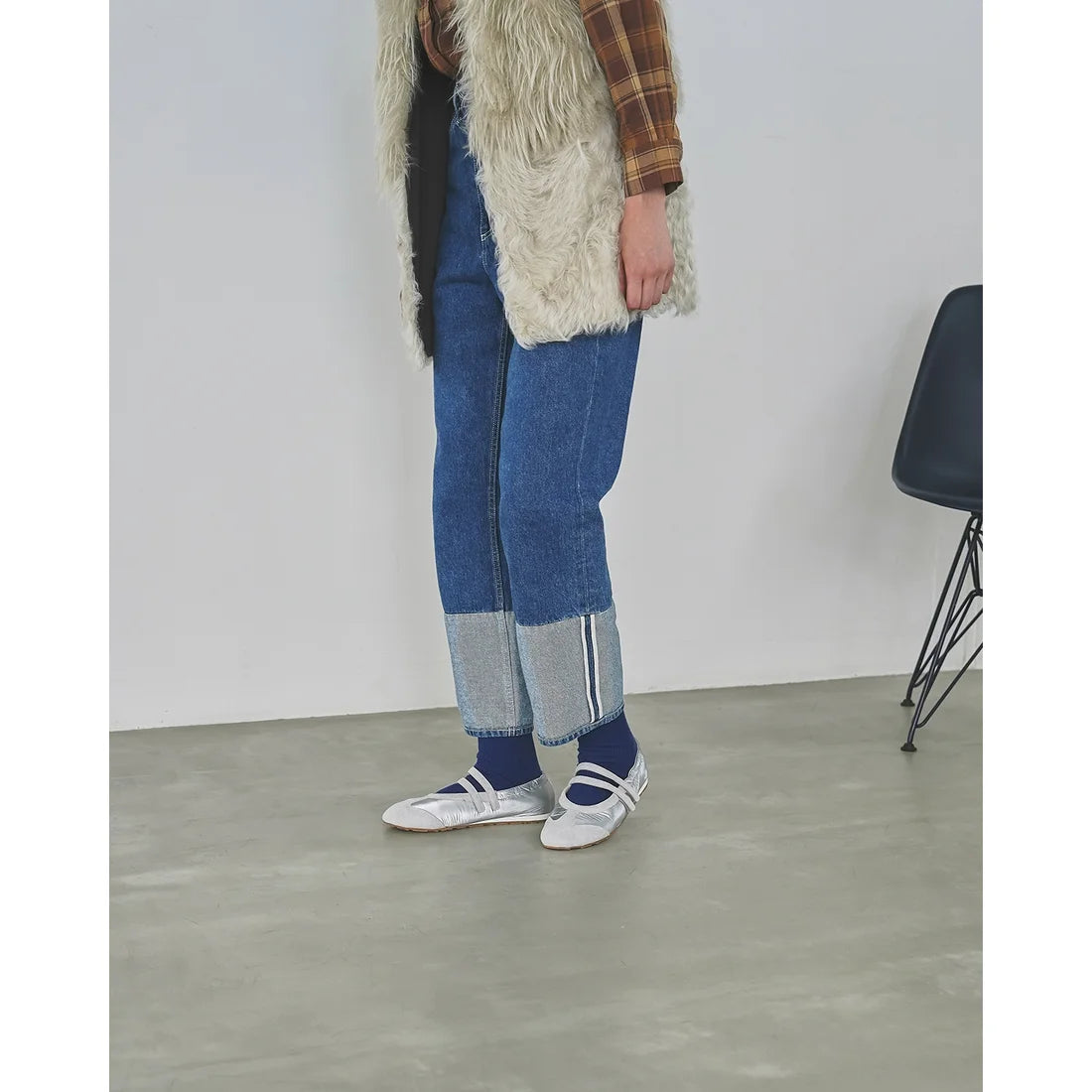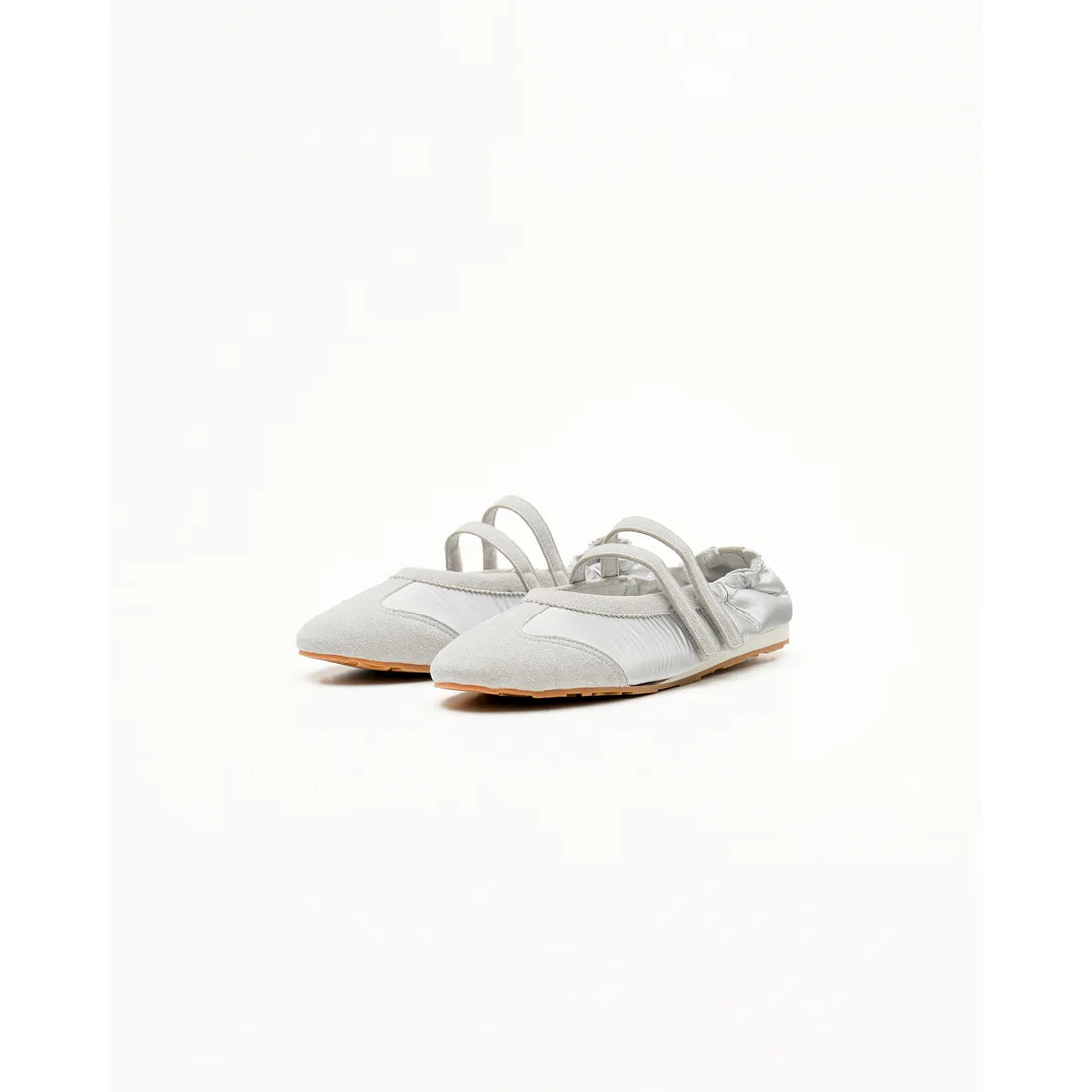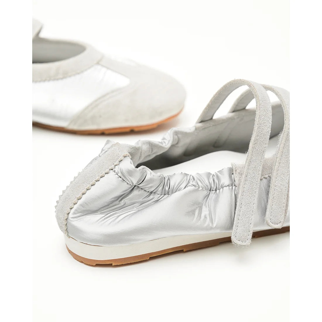 【新品】日本製Emma Francis 彈性褶邊瑪麗珍芭蕾舞鞋(銀色天鵝絨皮革)(09k-NY 162)