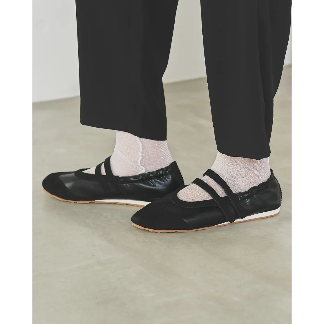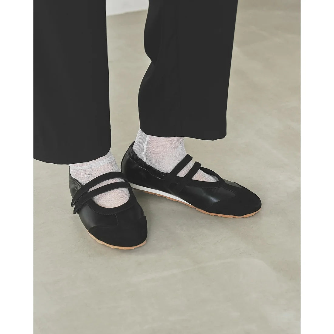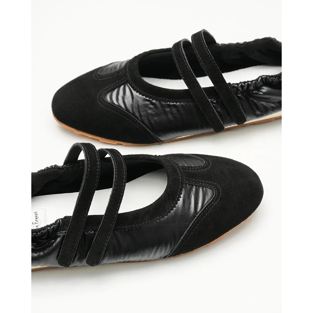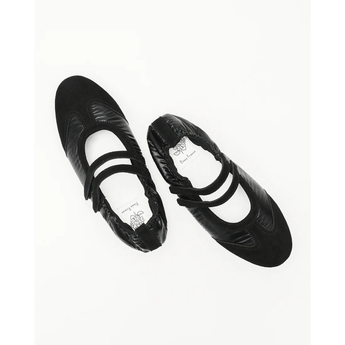 【新品】日本製Emma Francis 彈性褶邊瑪麗珍芭蕾舞鞋(黑色天鵝絨皮革)(09k-NY 101)