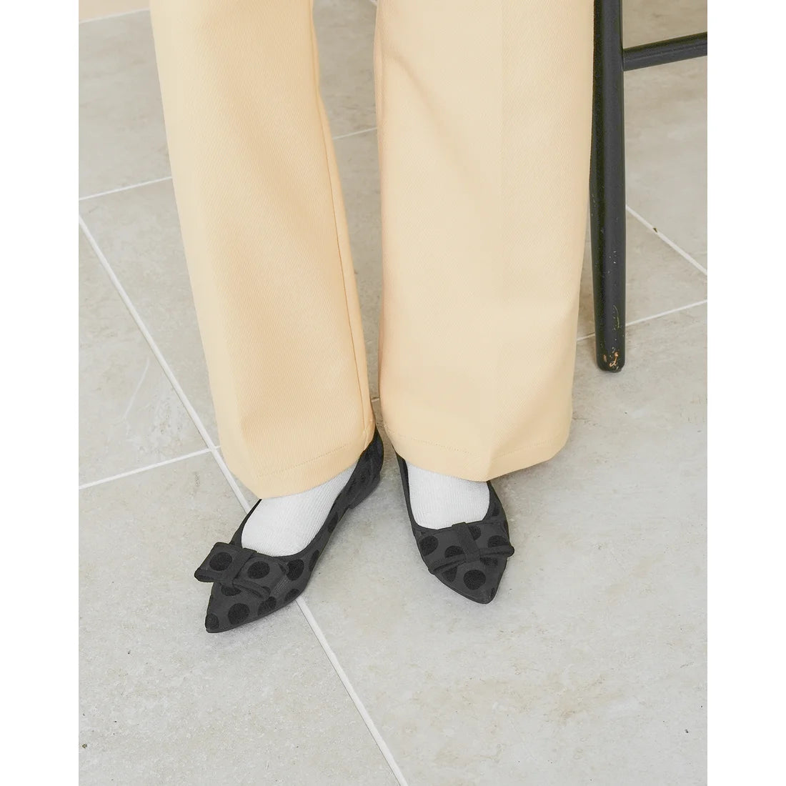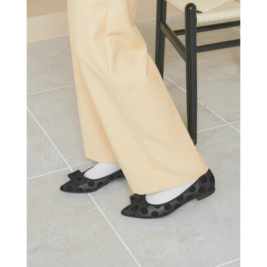 以輕盈的薄紗材質搭配立體絨點與優雅蝴蝶結設計,
